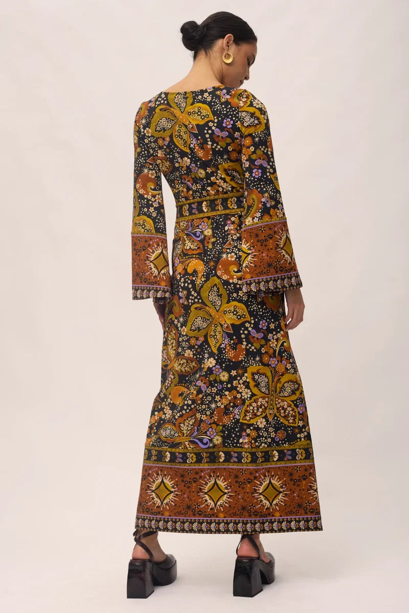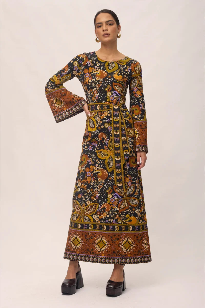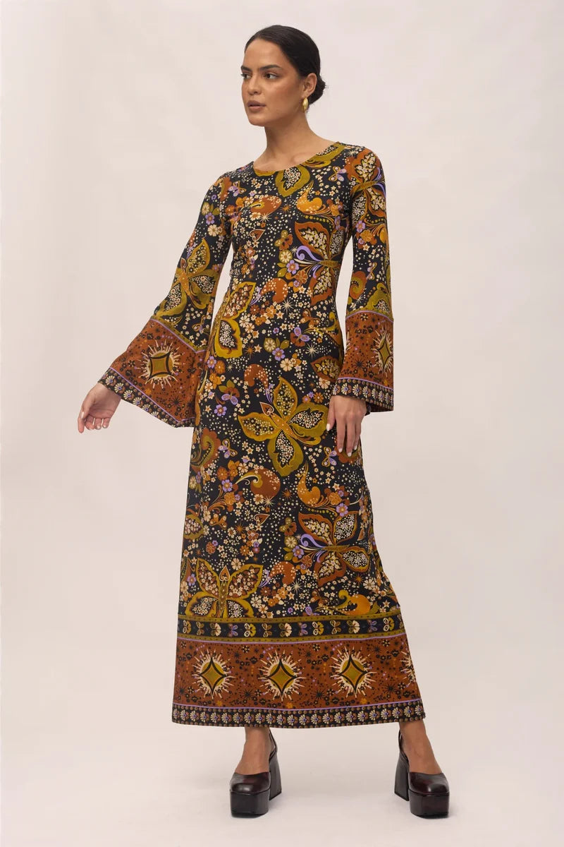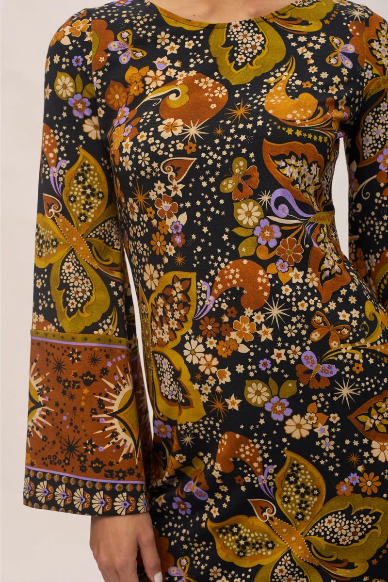 Introducing the Cora Maxi Dress in Starlight: the ultimate winter frock for vintage lovers! Made from thicker, stretchy cotton, this dreamy celestial print dress flatters all shapes and sizes. Features include a butterfly waist tie, bell sleeves, and maxi length. Get ready to turn heads!
