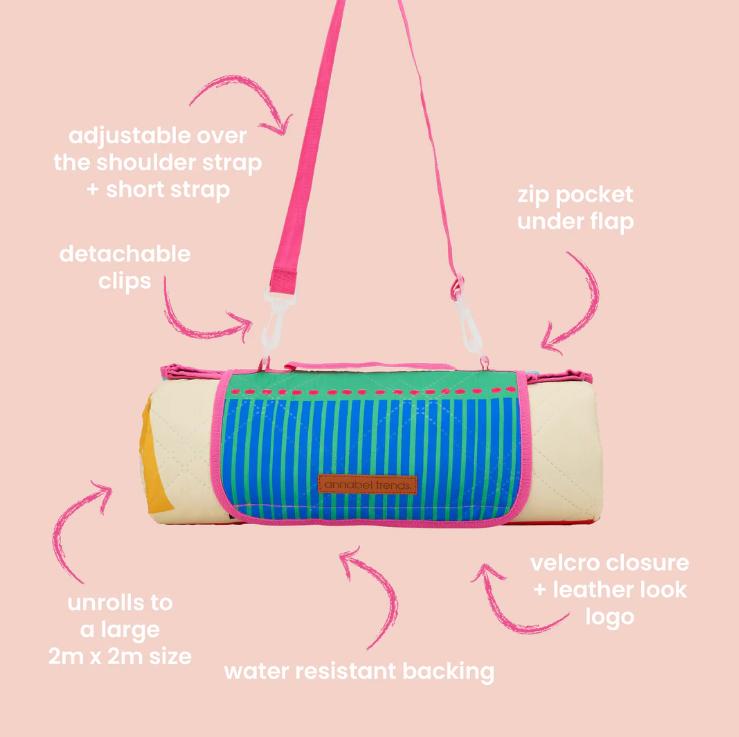 Make every outdoor adventure more fun with the Fiesta Picnic Mat! Featuring comfy inner foam cushioning, easy folding, and a secure velcro closure, it’s now even better with an extendable shoulder strap and a handy pocket for your phone and keys. Bright, spacious (2m x 2m), and made from durable, water-resistant materials, it’s ready to keep you comfy and stylish. Just keep it dry before rolling up, and you’re set for your next picnic!